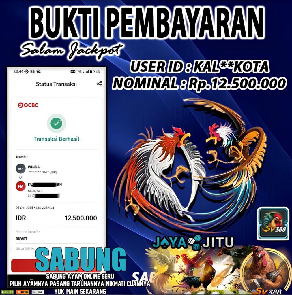 Kami ucapkan selamat atas kemenangan member kami yang telah berhasil mendapatkan kemenangan besar pada permainan (SV388 – SABUNG AYAM) dan melakukan withdraw sebesar Rp.12,500,000,- Tidak perlu waktu lama,pihak JAYAJITU langsung melakukan proses transfer dana ke rekening pemenang dan dana kemenangan sudah mendarat mulus ke rekening penerima.