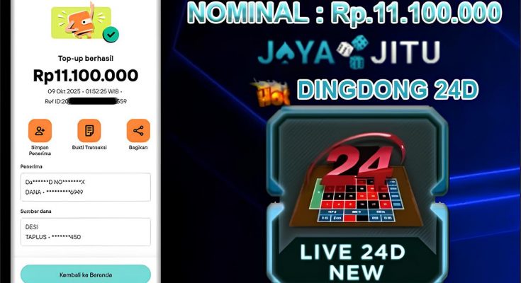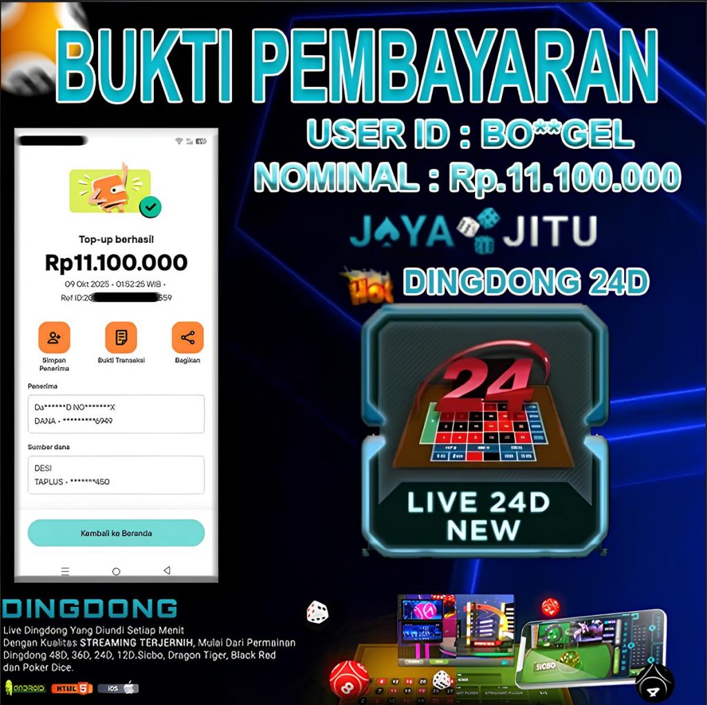 Kami ucapkan selamat atas kemenangan member kami yang telah berhasil mendapatkan kemenangan besar pada permainan (DINGDONG 24D) dan melakukan withdraw sebesar Rp.11.100.000,- Tidak perlu waktu lama,pihak JAYAJITU langsung melakukan proses transfer dana ke rekening pemenang dan dana kemenangan sudah mendarat mulus ke rekening penerima.